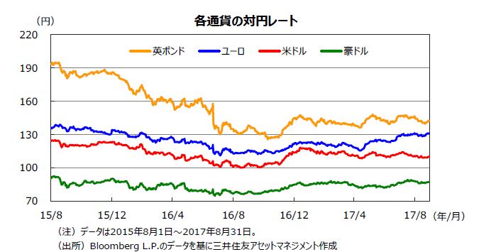 円相場は、対米ドル、豪ドルで上昇、対ユーロで下落しました。北朝鮮によるミサイル発射、トランプ米政権の内紛、スペインでのテロ発生等を受けてリスク回避の動きが強まり、中旬までは米ドルに対して円が買われました。下旬は4-6月期のGDP一次改訂値や8月のADP民間雇用者数といった米国の経済指標が事前予想を上回ったことから米ドルが持ち直しました。対豪ドルでも円は7月末の1豪ドル= 88.24円から8月末の同87.40円へ上昇しました。一方、ECBが早ければ今秋にも金融政策の正常化に着手するとの観測から欧州と日本の金利差が拡大するとの見方が強まり、7月末の1ユーロ=130.57円から8月末の同130.98円に、対ユーロでは下落しました。