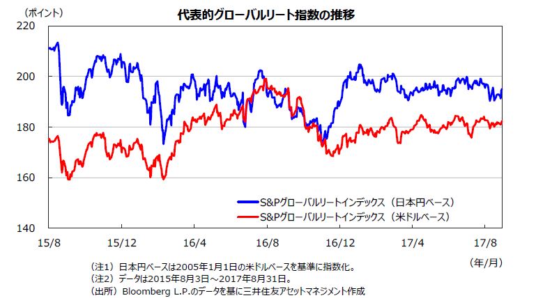 グローバルリート市場は、月の前半は北朝鮮のミサイル発射を受けてリスク回避の動きが強まったため、下落しました。その後ハト派的な内容のFOMC議事要旨等を受けて反発しましたが、前半の下げ分を埋めるには至らず、月間では小幅な下落となりました。
