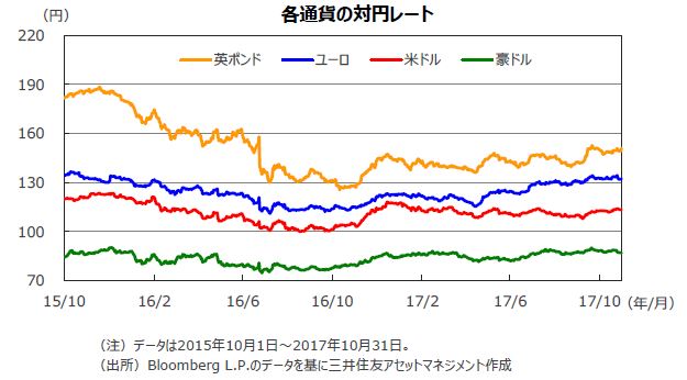 FRBは、10月31日~11月1日開催のFOMCで、政策金利(FFレート)の誘導レンジを1.00%~1.25%で据え置くことを決定しました。10月からECBは、10月26日の理事会で政策金利、預金ファシリティ金利をそれぞれ0.00%、▲0.40%に据え置きました。量的緩和政策については、18年1月以降の月間購入額を従来の600億ユーロから300億ユーロに半減し、18年9月まで続けることを決定しました。日本銀行は10月30~31日に開催した金融政策決定会合で、金融政策の現状維持を決定しました。短期の政策金利を▲0.1%、長期金利である10年物国債利回りをゼロ%程度に操作する金融調節を維持しました。長期国債を買い増すペースも年約80兆円を目処とすることを据え置きました。