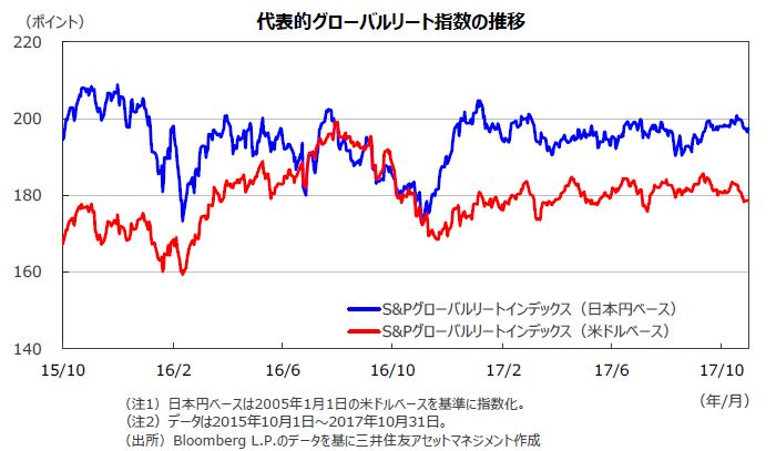 グローバルリート市場は、米景気・雇用の堅調な拡大を背景にFRBが年内利上げに踏み切るとの観測が強まったことなどを受け、長期金利が上昇したため、下落しました。ただ、円が主要通貨に対して下落したため、日本円ベースでは小幅な下落に止まりました。