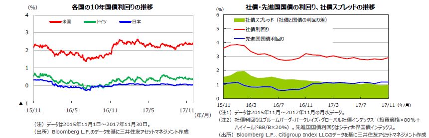 11月の米国10年国債利回りは小幅な上昇(債券価格は下落)となりました。米国の景気・雇用が堅調に推移しているためですが、インフレが落ち着いていることから大幅な金利上昇には至っていません。ドイツ10年国債利回りは、0.3%台半ばでこう着状態となりました。ドイツの7-9月期GDPは市場予想を上回りましたが、インフレの低位安定から利回りの上昇は小幅なものにとどまりました。一方、日本の10年国債利回りは低下しました。米国社債については国債とのスプレッドが拡大しました。社債スプレッドの拡大は、大型の買収・合併(M&A)に関わる資金調達の拡大に伴い社債の発行が増加したこと等によるものです。