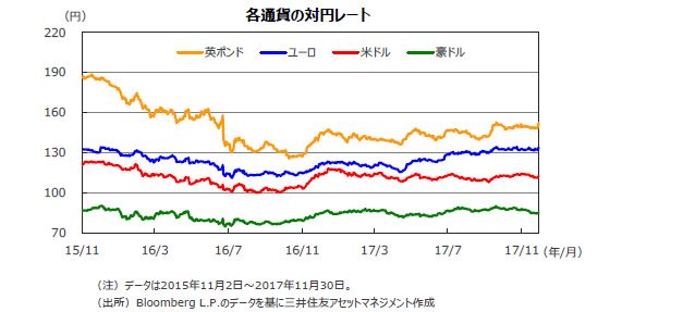 円相場は、対米ドルで上昇、対ユーロでは小幅な下落となりました。米税制改革の先行きに不透明感が強まったことや、FOMC議事要旨のインフレに対する評価がやや慎重になったこと等から、「FRBによる利上げの速度はやはり緩慢なものにとどまる」との見方が強まったことが、ドル安円高につながりました。欧州ではドイツの7-9月期GDP統計など市場予想を上回る景気指標が発表されたことを受け、円に対してユーロが上昇しました。