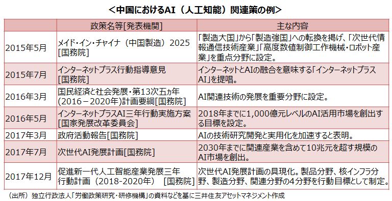 中国では、スーパーコンピュータの開発において躍進を遂げるなどAI関連分野における実績があるほか、国際競争力を持つ大手インターネット企業を有しています。こうした中、AI関連の振興策が次々と打ち出されるなど、 政府がトップダウン方式で政策運営を進めており、中国におけるAIの技術開発・市場開拓は想定以上のスピードで進む可能性 が考えられます。