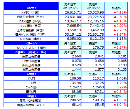 欧米の株式市場は、大幅に下落しました。米国株式市場は、週前半から金利上昇などを懸念して軟調に推移しましたが、週末にはNYダウは前日比665ドルと大幅に下落し、週間では▲4.12%下落しました。1月の米雇用統計で、平均時給の前年同月比上昇率が市場予想を上回る2.9%となり、米10年国債利回りが一時2.85%台に上昇したことなどを嫌気しました。日経平均株価は円高や米長期金利上昇を警戒して週前半から軟調な展開となり、週末は雇用統計の発表を控え様子見気分が強まり下落しました。週間では▲1.51%下落しました。欧州株式市場では、独DAX指数は、世界的な株安やユーロ高などを嫌気して週間では▲4.16%下落しました。英国FTSE指数も下落しました。中国株式市場は、上海総合指数は7週ぶり、香港ハンセン指数は8週ぶりに下落しました。