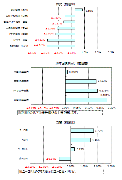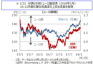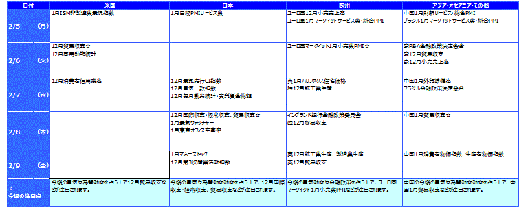 ドル、ユーロに対して円安となりました。対ドルでは日銀が意図的な国債買い入れ規模の縮小を否定したことや、1月の米雇用統計を受けて米長期金利が上昇したことなどから、週間では1.46%の円安となりました。対ユーロでは、ユーロ圏の長期金利上昇などを受け、週間では1.70%の円安となりました。