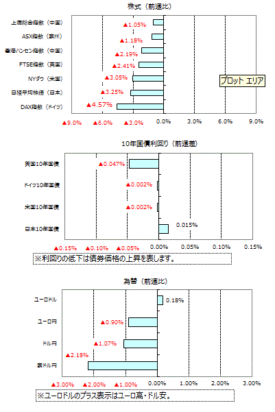 主要国の株式市場は下落しました。米国株式市場は、パウエル米連邦準備制度理事会(FRB)議長の議会証言がタカ派的であったことや、、米国が鉄鋼、アルミへの関税を引き上げると表明したことなどを受けて下落しました。NYダウは週間では3.05%下落しました。日経平均株価はパウエルFRB議長の議会証言や、米国が鉄鋼、アルミへの関税引き上げを表明したことなどを受けた米国株安や、105円台まで進んだ円高等を嫌気して下落しました。週間では3.25%下落しました。欧州株式市場では、独DAX指数は世界的な株安や大連立政権樹立への不透明感などから週間では4.57%下落しました。英国FTSE指数は下落しました。中国株式市場は、上海総合指数、香港ハンセン指数ともに下落しました。