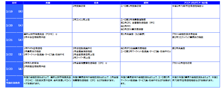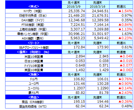 主要国の株式市場は、まちまちの動きとなりました。米国株式市場は、トランプ大統領が中国に対して貿易不均衡の改善などを求め貿易摩擦が高まるとの懸念や、ティラーソン国務長官の解任を受けた政権運営の不透明感も嫌気され、軟調な展開となりました。NYダウは週間では1.54%下落しました。日経平均株価は週初は、前週末発表の米2月雇用統計で、賃金の伸びが市場予想を下回り大幅上昇した米国株を好感して300円を上回る上昇で始まりました。その後は森友学園問題による安倍政権の求心力低下などを懸念して伸び悩みました。日経平均株価は週間では0.97%上昇しました。欧州株式市場では、英国FTSE指数は米国株安やポンド高を嫌気して、週間では0.84%下落しました。独DAX指数は小幅上昇しました。中国株式市場は、上海総合指数は下落、香港ハンセン指数は上昇しました。