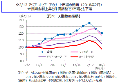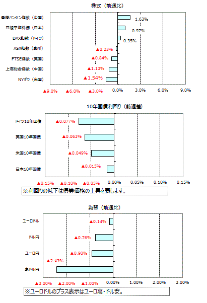 主要国の10年国債利回りは低下しました。米国の10年国債利回りは、トランプ大統領が中国に対して貿易不均衡の改善を求め貿易摩擦が高まるとの懸念や、ティラーソン国務長官の解任を受けたリスク回避の債券買いなどから週間では金利は0.049%低下しました。ドイツ、英国、日本の10年国債利回りはともに低下しました。