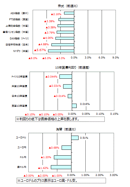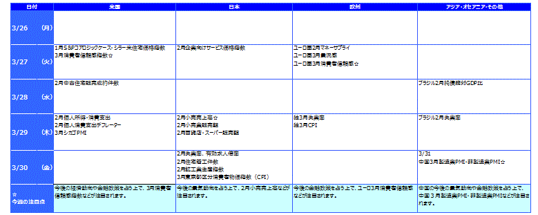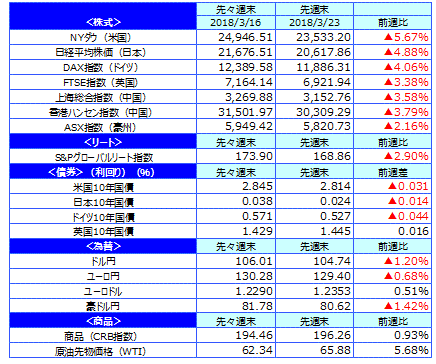 主要国の株式市場は大幅に下落しました。米国株式市場は、米トランプ政権が中国に対して知的財産権の侵害を理由に大統領権限による強力な貿易制限をかける「通商法301条」を発動すると表明し、貿易摩擦が高まるとの懸念や、マクマスター大統領補佐官の辞任を受けた政権運営の不透明感も嫌気され大幅に下落しました。NYダウは週間では5.67%下落しました。日経平均株価は、トランプ政権が中国に対して「通商法301条」を発動すると表明し、貿易摩擦が高まることへの警戒感や、森友学園問題による安倍政権の支持率低下懸念や円高などを嫌気して大幅に下落しました。日経平均株価は週間では4.88%下落しました。欧州株式市場では、英国FTSE指数、独DAX指数ともに世界的な株安などを背景に大幅に下落しました。中国株式市場は、上海総合指数、香港ハンセン指数ともに大幅に下落しました。
