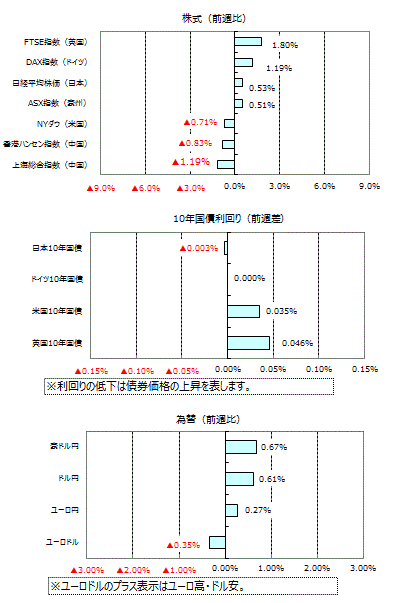 主要国の10年国債利回りは小幅な動きとなりました。米国の10年国債利回りは、米中貿易摩擦激化への懸念の高まりや後退を背景とした米国株の動きをみながら一進一退の動きとなり、週間では金利は0.035%上昇しました。英国の10年国債利回りは上昇、ドイツと日本の10年国債利回りはほぼ横ばいとなりました。