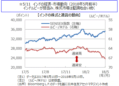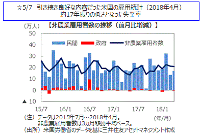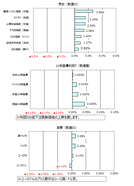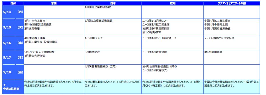 主要国の株式市場は上昇しました。米国株式市場では、トランプ大統領がイラン核合意からの米国の離脱を発表したことで、週前半は上値の重い展開となりましたが、原油高を受けたエネルギー株や、金利上昇を好感した金融株が上昇し、NYダウは週間では2.34%上昇しました。日本株式市場は、米国株高、円安を好感して堅調な展開となりました。3月期決算発表がピークを迎えましたが、概ね想定の範囲内で市場全体への影響は限定的となりました。週間では日経平均株価は1.27%上昇しました。欧州株式市場は、米国株高や原油高を受けて、ドイツDAX指数や英FTSE指数が続伸するなど、堅調地合いを維持しました。中国株式市場では、過度な米中貿易摩擦懸念が後退したことなどから上海総合指数、香港ハンセン指数はともに上昇しました。