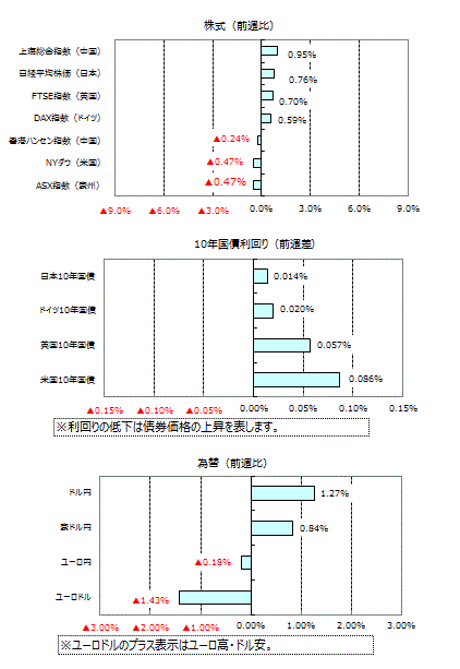 円は主要通貨に対してまちまちの動きとなりました。対ドルでは米10年国債利回りが引続き上昇したことや、本邦企業による海外企業の買収への思惑から週間では1.27%の円安となりました。対ユーロでは小幅な円高となりました。