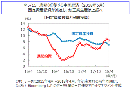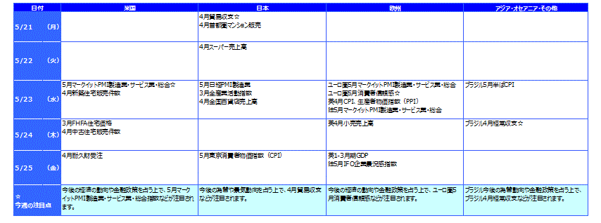 主要国の株式市場はまちまちの動きとなりました。米国株式市場は、長期金利の上昇や米中貿易摩擦懸念などが意識され上値の重い展開となりました。原油相場の堅調が続いたことでエネルギー株が上昇し相場を支えましたが、金利上昇を嫌気して不動産株などが下落、NYダウは週間では0.47%下落しました。日本株式市場は、3月期決算発表が週前半でほぼ終了し、後半は材料の乏しい展開となりましたが、一段と進んだ円安を好感して堅調な展開となりました。週間では石油・石炭製品など市況関連株中心に日経平均株価は0.76%上昇しました。欧州株式市場は、ユーロ安や原油高を受けて、ドイツDAX指数や英FTSE指数が続伸するなど、堅調地合いを維持しました。中国株式市場では、上海総合指数は4週連続上昇しました。香港ハンセン指数は米長期金利の上昇などを嫌気して小幅下落しました。