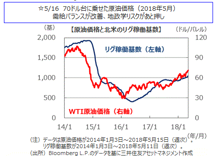 原油価格は、対イラン制裁、エルサレムへの米国大使館移転による中東での地政学リスクの高まりや、米原油在庫の減少などから上昇しました。週間では0.82%上昇しました。