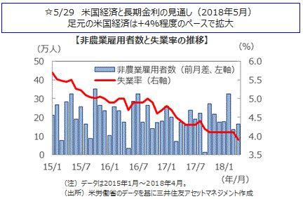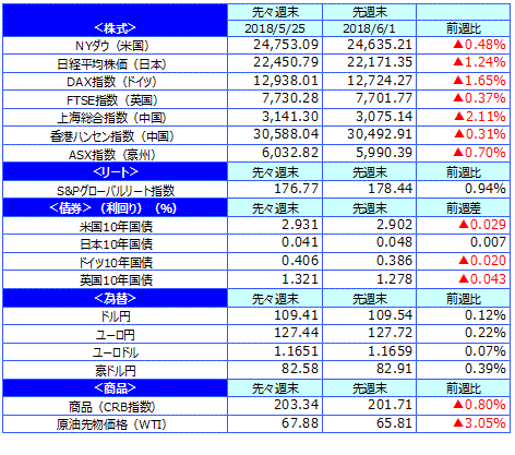 主要国の株式市場は下落しました。米国株式市場は、イタリアやスペインの政局混迷が嫌気され下落してスタートしました。その後は米朝首脳会談が実施される見通しとなりリスク回避の流れが後退したことや、週末に発表された米5月雇用統計が総じて強い結果となったものの、利上げペースの加速懸念を高めるほどではなかったことから安心感につながり、下落幅を縮小しました。NYダウは週間では0.48%下落しました。日本株式市場は、週前半は南欧の政局混迷が嫌気され、日経平均株価は一時22,000円を下回りましたが、米朝首脳会談が実施される見通しとなったことなどから円高が一服し、下げ渋る展開となりました。週間では日経平均株価は1.24%下落しました。欧州株式市場は、南欧の政局混迷などが嫌気され、ドイツDAX指数や英FTSE指数はともに下落しました。中国株式市場では、上海総合指数、香港ハンセン指数はともに下落しました。