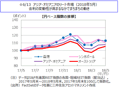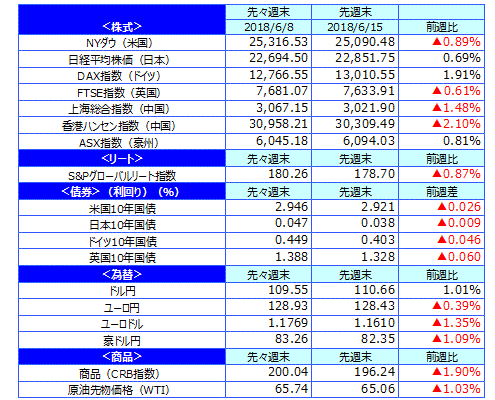 主要国の株式市場はまちまちとなりました。米国株式市場は、南欧の政局懸念後退などを好感して上昇して始まりましたが、トランプ政権が中国からの輸入品の内、約500億ドル相当に対して25%の制裁関税を課すと発表したことで、米中貿易摩擦への懸念が高まり週後半は弱含みました。NYダウは週間では0.89%下落しました。日本株式市場は、米朝首脳会談が予定通り開催されたことから両国の関係改善期待が高まり週前半は上昇しましたが、米連邦公開市場委員会(FOMC)での利上げは織り込み済みであったため、円安一服となったことなどから伸び悩みました。週間では日経平均株価は0.69%上昇しました。欧州株式市場は、ドイツDAX指数は欧州中央銀行(ECB)理事会の結果を受けて長期金利が低下したことなどを好感して上昇、英FTSE指数は下落しました。中国株式市場では、上海総合指数、香港ハンセン指数は米中貿易摩擦激化を懸念して下落しました。