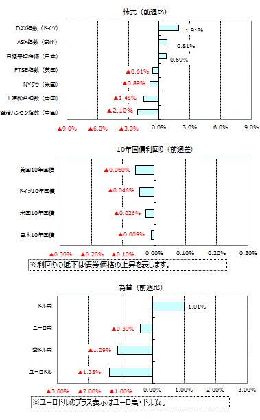 主要国の10年国債利回りは低下しました。米国の10年国債利回りは、ECB理事会の結果を受けて欧州の長期金利が低下したことや、米中貿易摩擦への懸念の高まりなどを背景に低下しました。週間では0.026%低下しました。ドイツと英国の10年国債利回りは低下しました。日本の10年国債利回りも小幅低下しました。