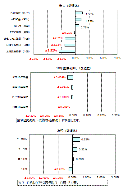 欧米の10年国債利回りは小幅低下しました。米国の10年国債利回りは、米中貿易摩擦激化の懸念などから低下しました。週間では0.038%低下しました。ドイツと英国の10年国債利回りは小幅低下しました。日本の10年国債利回りはほぼ横ばいとなりました。
