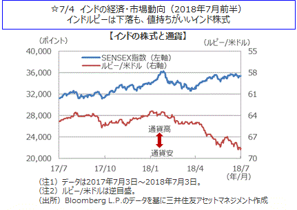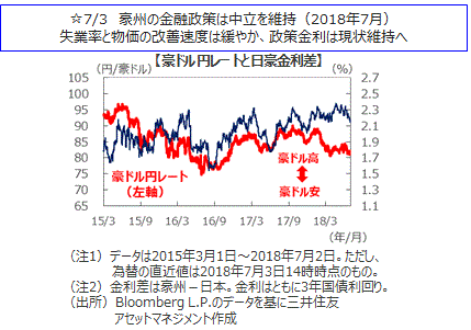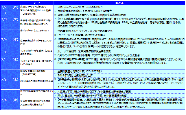 主要国の株式市場はまちまちとなりました。米国株式市場は、週末6日に中国製品に対する制裁関税の発動を控えるなか、週前半は様子見姿勢が強い展開となりました。5日には駐独米大使が米国とEU間の自動車の関税をゼロにすると提案したことで貿易戦争への過度な警戒感が後退し上昇しました。6日には予定通り米政府による340億ドルの中国製品に対する追加関税が発効されましたが、市場の反応は限定的となり続伸しました。NYダウは週間では0.76%上昇しました。日本株式市場では、米中貿易摩擦への警戒からリスク回避姿勢が強まる中、日経平均株価は週初は492.58円安と大幅下落して始まりました。その後も週末に中国製品に対する制裁関税の発動を控え続落、週末の6日は予定通り発動されましたが、材料出尽くし感が強まり反発しました。週間では日経平均株価は2.32%下落しました。欧州株式市場は、ドイツDAX指数は上昇、英FTSE指数は下落しました。中国株式市場では、上海総合指数、香港ハンセン指数は米中貿易摩擦激化への警戒感や人民元安などを嫌気して下落しました。