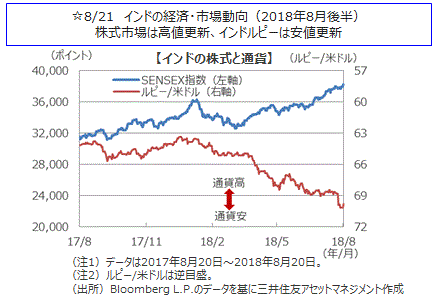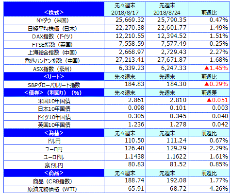 主要国の株式市場は豪州市場を除き上昇しました。米国株式市場は、米中双方が第2弾の追加関税を発動したことなど不透明感はありましたが、週末はパウエル米連邦準備制度理事会(FRB)議長の講演で緩やかな利上げスタンスが維持されたことで安心感が広がり上昇しました。NYダウは週間では0.47%上昇しました。S&P500とNASDAQ総合指数は高値を更新しました。日本株式市場では、新興国に対する過度な警戒が和らいだことや米国での9月の利上げが意識され、円安となったことなどを好感して上昇しました。週間では日経平均株価は1.49%上昇しました。欧州株式市場では、トルコや新興国に対する過度な警戒が和らいだことなどを受けて、ドイツDAX指数は1.51%、英FTSE指数は0.25%上昇しました。中国株式市場では、政府系機関による買い支え観測が支援材料となり、上海総合指数、香港ハンセン指数はともに上昇しました。米中双方が第2弾の追加関税を発動しましたが、影響は限定的となりました。豪州は首相交代に伴う政治的不透明感が嫌気され下落しました。