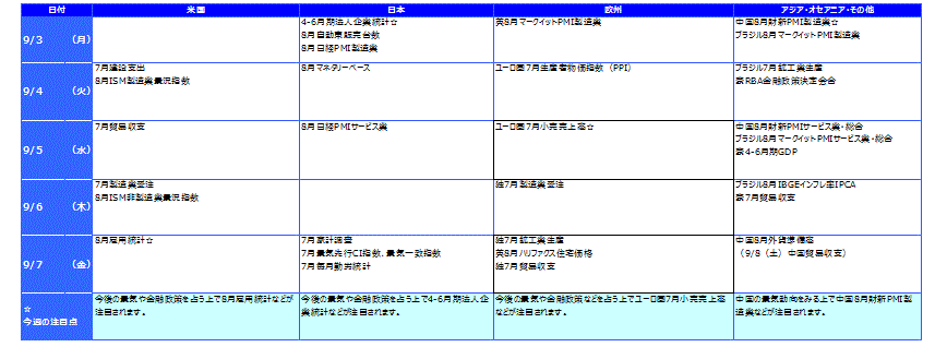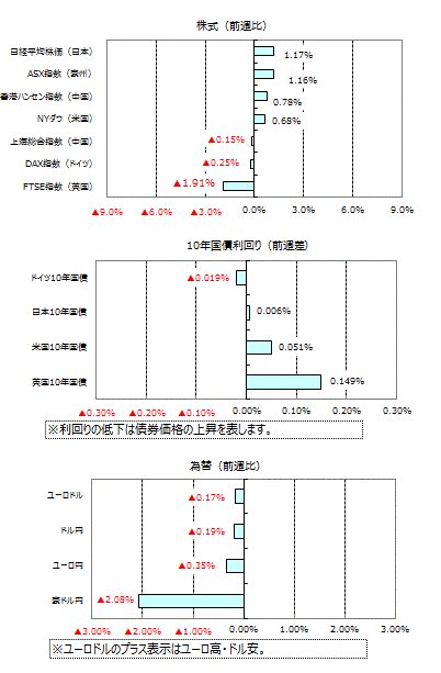米国の10年国債利回りは、8月の米消費者信頼感指数が高水準となったことなどから、週間では利回りが0.051%上昇しました。英国10年国債利回りは上昇、日本とドイツの10年国債利回りはほぼ横ばいでした。