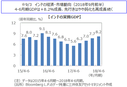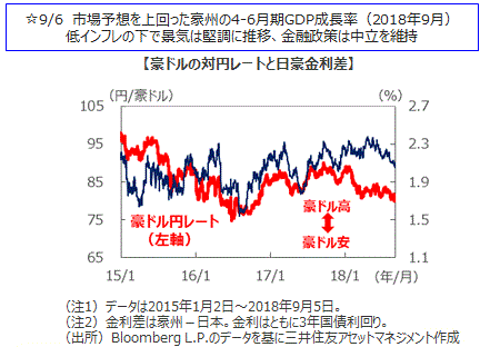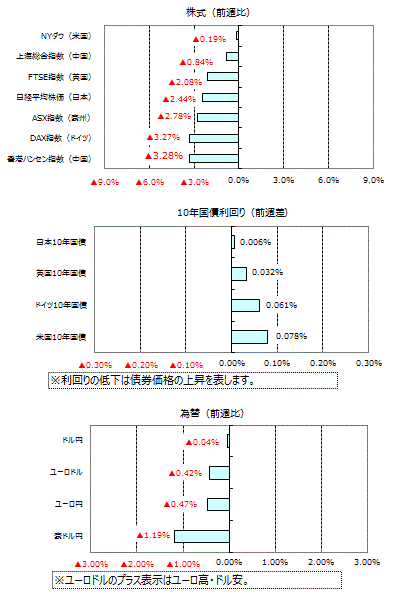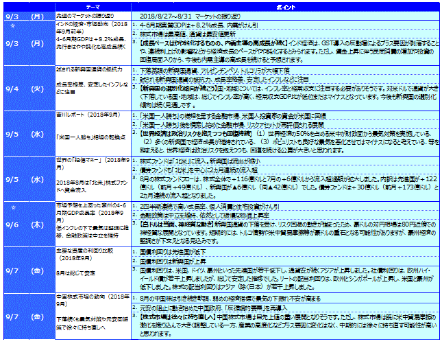 主要国の株式市場は下落しました。米国株式市場は、週前半はもみ合いとなりましたが、週末はトランプ大統領が現在検討している2,000億ドル相当の中国からの輸入への制裁関税に加え、更なる追加関税を課すこともできると表明したことやハイテク関連株が下落したことなどからNYダウは週間では0.19%下落しました。ハイテク株の比率の高いNASDAQ総合指数は2.55%下落しました。日本株式市場では、日米、米中間の通商摩擦懸念の他、台風、地震と天災が相次いで発生したことから連日の下落となりました。先週は日経平均株価は5日連続の下落となり、2.44%下落しました。欧州株式市場では貿易摩擦懸念が再び高まったことや、原油価格下落などを受けて英FTSE指数は2.08%下落しました。ドイツDAX指数は3.27%下落しました。中国株式市場では、香港ハンセン指数はトランプ米大統領が週内にも2,000億米ドル相当の対中制裁関税の発動を指示するとの警戒感が広がり3.28%下落、上海総合指数は0.84%下落しました。