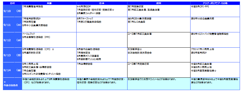 米国の10年国債利回りは、米8月のISM製造業景気指数や雇用統計が強い内容となったことなどから、週間で利回りが0.078%上昇しました。ドイツと英国10年国債利回りは上昇、日本の10年国債利回りはほぼ横ばいでした。