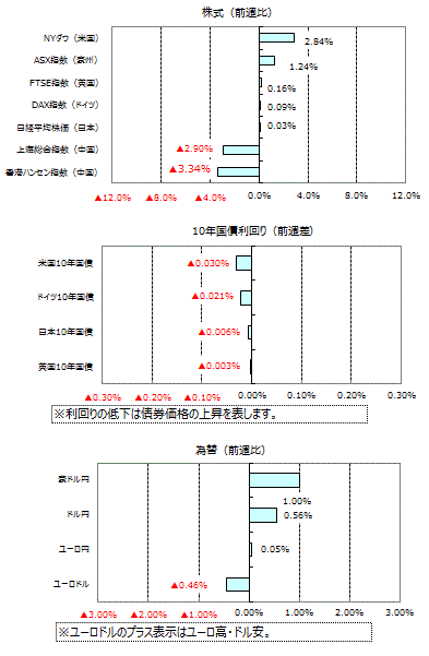 米国の10年国債利回りは、米連邦公開市場委員会(FOMC)声明で利上げ継続姿勢が確認されたことで一時上昇しました。その後株式市場が伸び悩んだことや商品市況が下落したことから週間では利回りが0.03%低下しました。ドイツの10年国債利回りも小幅低下、英国、日本の10年国債利回りは、ほぼ横ばいとなりました。