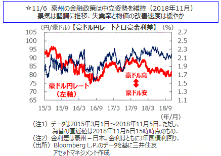 主要国の株式市場はまちまちの動きとなりました。米国株式市場は、米中間選挙が予想通りの結果となり不透明感が払しょくされたことや、トランプ米大統領がインフラ投資などで民主党と協調すると表明したことなどを好感して、NYダウは週間では2.84%上昇しました。日本株式市場は、NYダウが上昇したことを好感して上昇する局面もありました。ただ決算発表がピークを迎え、業績モメンタムが低下傾向にあることなどから様子見が強い展開となりました。日経平均株価は、週間ではほぼ横ばいとなりました。欧州株式市場では、ドイツDAX指数、英国FTSE指数ともにほぼ横ばいとなりました。中国本土株市場は、上海総合指数は2.90%、香港ハンセン指数は3.34%下落しました。米中間選挙後もトランプ米大統領は貿易摩擦を巡る中国への強硬姿勢を変えないとの見方が多く、米中貿易摩擦解消への期待が後退したことが背景です。