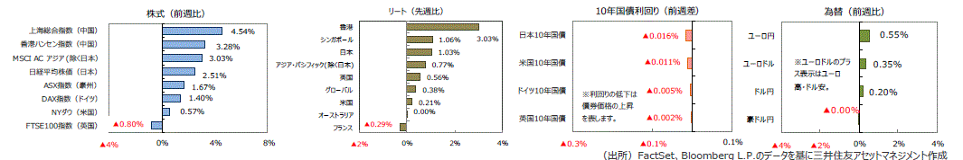 米国の10年国債利回りは、フィラデルフィア連銀の製造業景況感指数が予想を下回ったことなどを受けて、週間では0.011%低下しました。ドイツ、英国はほぼ横ばい、日本の10年国債利回りは低下しました。