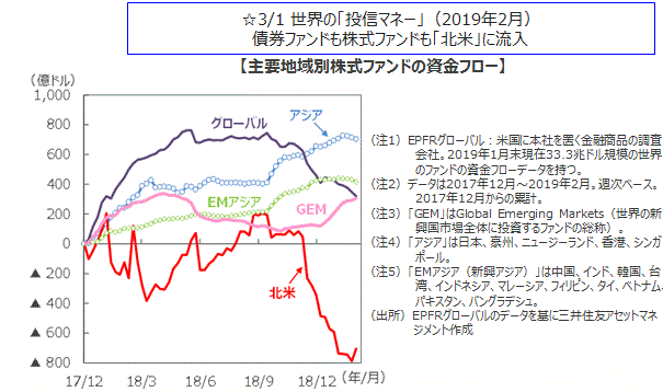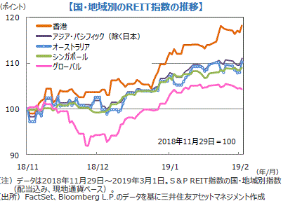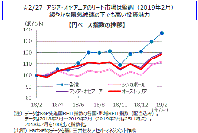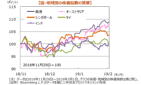 主要国の株式市場はまちまちの動きとなりました。米国株式市場は、3月2日からの対中追加関税が見送られたことが好感される一方、米朝首脳会談の決裂やインド・パキスタンの紛争による地政学リスクが意識さたことなどが重石となり、ほぼ横ばいとなりました。日本株式市場は、米朝首脳会談の決裂を嫌気して下落する局面もありましたが、円安や中国本土株の上昇などを好感して上昇しました。日経平均株価は週間では0.83%上昇しました。欧州株式市場では、ドイツDAX指数は米国の対中追加関税の見送りなどを好感して1.26%上昇しました。英国FTSE指数はポンド高などを嫌気して1.00%下落しました。中国株式市場は、米中協議を受けて追加関税が見送られたことなどを好感して上海総合指数は6.77%と大幅に上昇しました。香港ハンセン指数はほぼ横ばいとなりました。