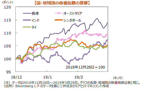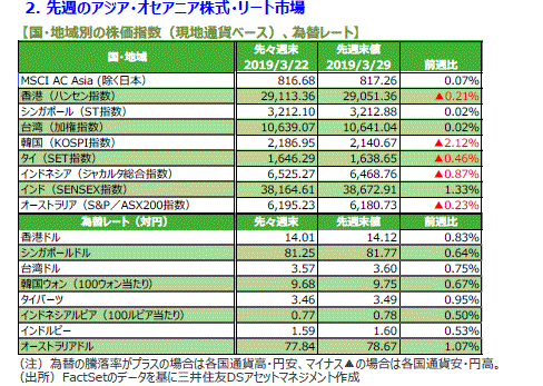 主要国の株式市場はまちまちの動きとなりました。米国株式市場は、長短金利の逆転が続き、世界的景気後退の可能性が懸念されたものの、米政治リスクの後退や、米中通商協議の進展期待、緩和的金融政策の長期化見通しなどを背景に、NYダウは週間では1.67%上昇しました。日本株式市場では、欧州の軟調な経済指標などを受けて欧米で長期金利が低下、米国では長短金利の逆転が続いたことから世界的景気後退が懸念され、日経平均株価は1.95%下落しました。欧州株式市場では、景気悪化への懸念はあるものの米中通商協議の進展期待などからドイツDAX指数は1.42%上昇しました。英国FTSE指数はポンド安などを好感して0.99%%上昇しました。中国株式市場は、上海総合指数、香港ハンセン指数ともに小幅に下落しました。