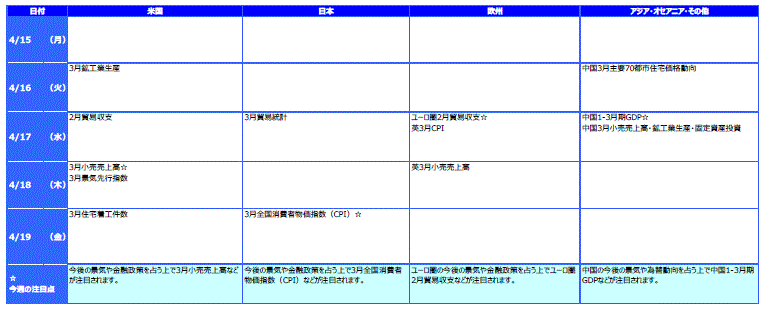 円は対ユーロでは、中国や米国の堅調な経済統計などを受けて週間で1.01%下落しました。対米ドルでは3月のFOMC議事要旨で、年内の利下げ観測が後退したことなどから0.26%下落しました。