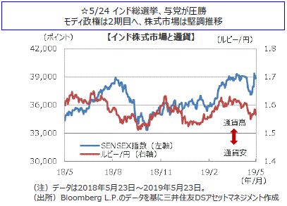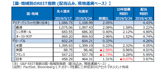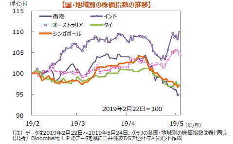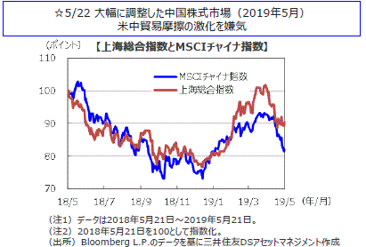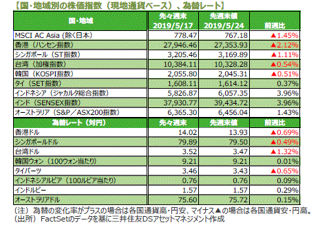 主要国の株式市場は概ね下落しました。米国株式市場は、米国が中国の通信機器大手との取引規制に加え、ビデオ監視装置企業にも同様の制限を検討との報道があり、米中の貿易交渉が行き詰まるとの懸念を受けて、NYダウは週間では0.69%下落しました。日本株式市場は、1-3月期のGDPが市場予想を大きく上回りましたが影響は限定的で、むしろ米中貿易摩擦激化懸念などを嫌気して、日経平均株価は0.63%下落しました。欧州株式市場は、米中の貿易交渉が行き詰まることへの懸念や英国のEU離脱を巡る不安などが嫌気され下落しました。中国株式市場は、米中の貿易摩擦激化懸念などから上海総合指数は1.02%、香港ハンセン指数は2.12%下落しました。豪州株式市場は、総選挙での与党勝利や中銀の利下げ期待の高まりを受けて上昇しました。