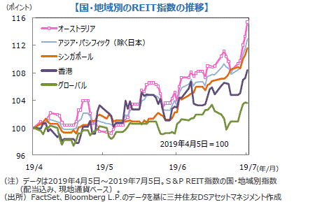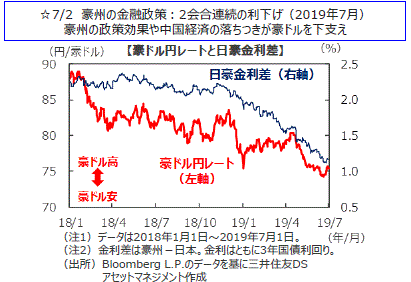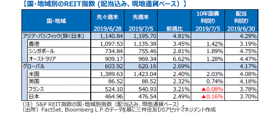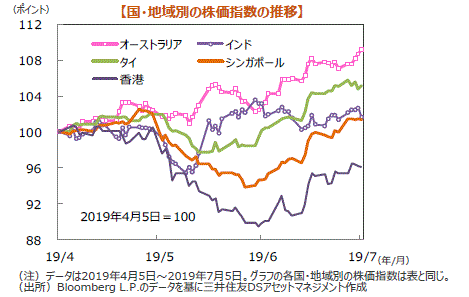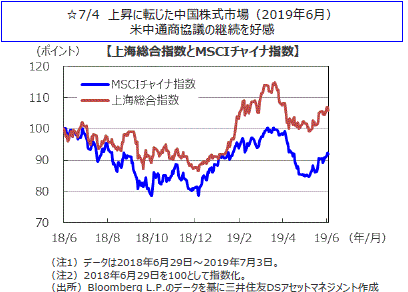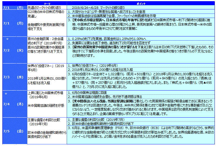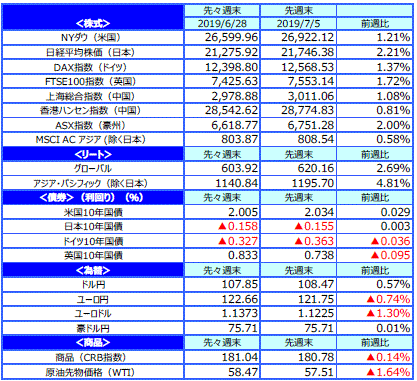 主要国の株式市場は上昇しました。米国株式市場は、6月28、29日の主要20カ国・地域(G20)サミットでの米中首脳会談で両国が通商協議再開で合意し、さらなる追加関税が回避されたことが好感され、NYダウは史上最高値を更新するなど上昇しました。NYダウは週間では1.21%上昇しました。日本株式市場は、米中首脳会談での通商協議再開の合意を好感して大幅に上昇して始まり、その後は週末に米雇用統計の発表を控え、もみ合いの動きとなりました。日経平均株価は2.21%上昇しました。欧州株式市場は、米中首脳会談での通商協議再開の合意や、欧州圏での金融緩和期待などを背景に上昇しました。中国株式市場は、米中首脳会談での通商協議再開の合意を好感して、上海総合指数は、1.08%、香港ハンセン指数は0.81%上昇しました。