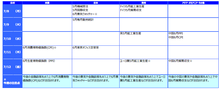 米国の10年国債利回りは、6月の非農業部門雇用者数の伸びが市場予想を上回ったことで大幅な利下げ期待が後退し、0.029%上昇しました。ドイツ、英国の10年国債利回りは欧州圏での金融緩和期待から低下しました。