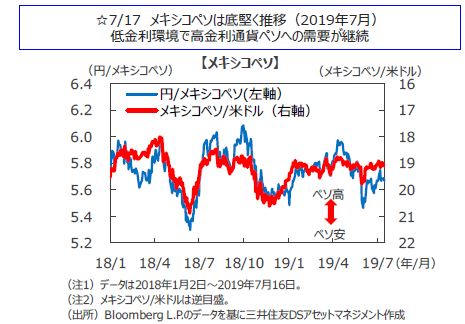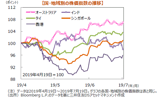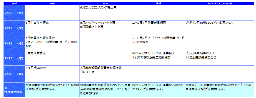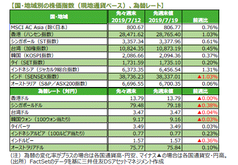 米国株式市場は、高値警戒感に加えて、米中通商交渉の先行き不透明感が嫌気されたことや、中東での地政学的リスクの高まりなどを受け、NYダウは週間で0.65%下落しました。日本株式市場は、週末に参院選を控え不安定な動きとなり、日経平均株価は取引時間中に一時21,000円を下回る局面もありました。ただ週末には半導体関連株などを中心に400円超上昇した結果、日経平均株価は週間で1.01%下落となりました。欧州株式市場は、米中通商交渉の先行き不透明感などが嫌気されドイツDAX指数が0.51%下落、FTSE100指数はほぼ横ばいとなりました。中国株式市場は、中国政府の景気対策への期待などから香港ハンセン指数は1.03%上昇しました。上海総合指数は0.22%下落しました。