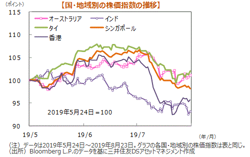 主要国の株式市場はまちまちの動きとなりました。米国株式市場では、中国通信機器大手に対する禁輸措置の一部猶予措置を延長したことなどから堅調に推移していましたが、週末23日は中国が米国の対中制裁関税第4弾に対する対抗措置を打ち出し、米国はそれへの対抗を行う意志を表明したため大幅に下落しました。NYダウは週間では0.99%下落しました。日本株式市場は、日本時間での取引期間中は米国株が堅調で為替が落ち着いていたことなどから、日経平均株価は1.43%上昇しました。欧州株式市場は、ドイツの景気刺激策関連報道などが好感されドイツDAX指数は0.42%上昇、ポンドの反発が嫌気されFTSE100指数は0.31%下落しました。中国株式市場は、中国人民銀行が企業の借り入れ負担軽減に向けた金利制度の改革を発表したことが好感され、上海総合指数は2.61%、香港ハンセン指数は1.73%上昇しました。