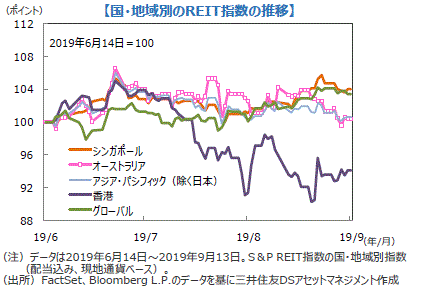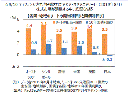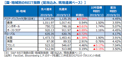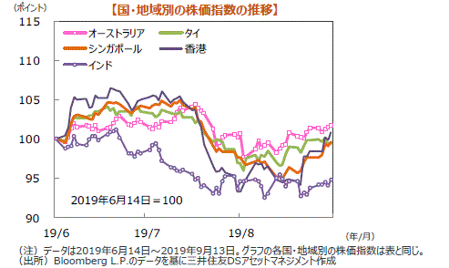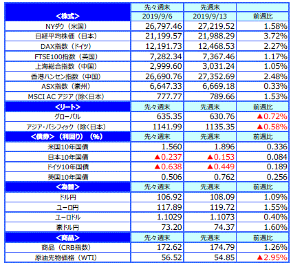 主要国の株式市場は上昇しました。米国株式市場では、トランプ米大統領が2,500億ドル分の対中関税の25%から30%への引き上げを10月15日に2週間先送りするとしたことや、欧州中央銀行(ECB)理事会で中銀預金金利の引き下げや量的緩和の再開を決めたことなどを好感して、NYダウは週間では1.58%上昇しました。日本株式市場は、米中交渉進展への期待が高まったことやECBの金融緩和の再開などを背景に米国株高や円安が進展したことなどを好感して日経平均株価は3.72%上昇しました。欧州株式市場は、米中貿易交渉の進展期待やECBによる金融緩和の再開などが好感され、ドイツDAX指数は2.27%、FTSE100指数は1.17%上昇しました。中国株式市場は、米中貿易交渉の進展期待やECBによる金融緩和の再開などが好感され、上海総合指数は1.05%、香港ハンセン指数は2.48%上昇しました。
