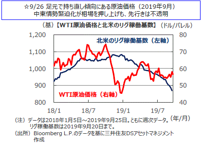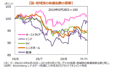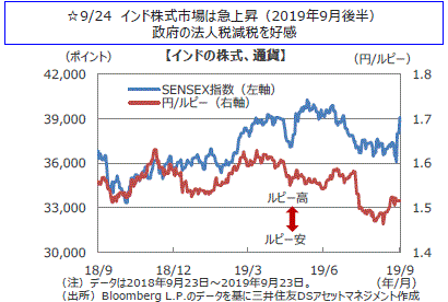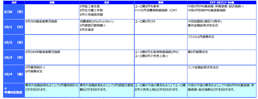 米国株式市場では、民主党がトランプ大統領に対する弾劾手続きを求めたことや、トランプ大統領が米国による中国への投資の制限を検討していると報じられたことなどを嫌気して、NYダウは週間では0.43%下落しました。日本株式市場は、トランプ米大統領が米中交渉の早期合意に前向きの見方を示したことで、TOPIX は一時年初来高値を更新する局面もありました。ただ27日の9月末の配当権利落ちの影響が大きく、週間では日経平均株価は0.91%下落しました。配当落ちの影響を除くと日経平均株価はほぼ横ばいでした。欧州株式市場では、ドイツの弱い経済指標などが嫌気され、ドイツDAX指数は0.70%下落、一方、イングランド銀行(英中央銀行)の利下げ示唆を受けてポンドが下落したことなどが好感され、FTSE100指数は1.11%上昇しました。中国株式市場では、米中協議に対する警戒などから上海総合指数は2.47%、香港ハンセン指数は1.82%下落しました。