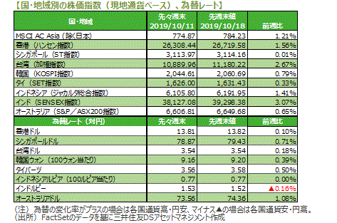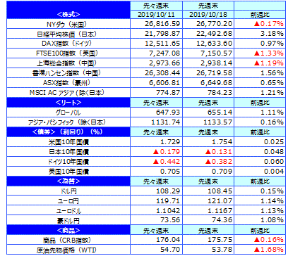 米国株式市場は、NYダウは好調な7-9月期決算発表や英国の合意なき欧州連合(EU)離脱の回避見通しを背景に、17日までおおむね堅調に推移しましたが、週末はダウ構成銘柄の航空機と医療大手の大幅な下落により、NYダウは下落しました。週間ではNYダウは0.17%下落しました。日本株式市場は、前週の米中閣僚級協議で両国が歩み寄り、10月15日に予定されていた米国による対中追加関税の引き上げが見送られたことや米企業の好業績を好感して大幅に上昇し、16日には年初来高値を更新しました。週間では日経平均株価は3.18%上昇しました。欧州株式市場では、英国の合意なきEU離脱の回避期待などからドイツ株は上昇したものの、英国株はポンド高が嫌気され下落しました。ドイツDAX指数は0.97%上昇、FTSE100指数は1.33%下落しました。中国株式市場では、上海総合指数は1.19%下落した一方、香港ハンセン指数は1.56%上昇しました。