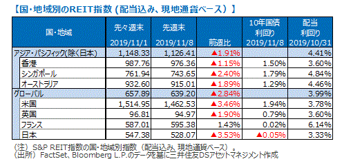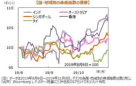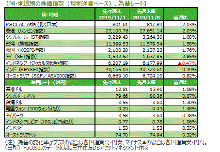 米国株式市場は、中国商務省が、発動済みの追加関税を段階的に撤廃する方針で米国と一致したと発表したことから、昨年来の米中通商摩擦が沈静化するとの期待が高まり上昇しました。NYダウは史上最高値を更新し、週間では1.22%上昇しました。日本株式市場は、米中通商交渉の進展期待を受けた円安・米国株高や、9月の世界半導体売上高の前月比増加を受けた半導体市場の回復期待の高まりなどを好感して景気敏感株を中心に上昇しました。週間では日経平均株価は2.37%上昇しました。欧州株式市場では、米中通商交渉の進展期待などから上昇しました。ドイツDAX指数は2.06%、FTSE100指数は0.78%上昇しました。中国株式市場では、米中通商交渉の進展期待などを受け、上海総合指数は0.20%、香港ハンセン指数は2.03%上昇しました。