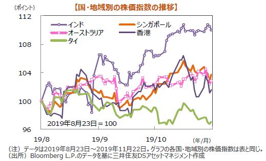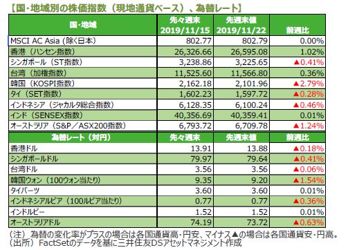 世界の株式市場は高安まちまちとなりました。米国株式市場では、週初にNYダウが史上最高値を更新しましたが、その後米中の「第1段階」の合意文書への署名が来年にずれ込むと報道されたことなどから反落し、週間で0.46%下落しました。日本株式市場は米中通商協議に対する先行き不透明感が高まったことや、米議会が香港での人権尊重や民主主義の確立を支援する「香港人権・民主主義法案」を可決したことからやや軟調な展開となりました。日経平均株価は0.82%下落しました。欧州株式市場では、ドイツDAX指数が0.59%下落した一方で、ポンドが弱含んだことなどからFTSE100指数は反発し、0.33%上昇しました。中国株式市場では、米議会の「香港人権・民主主義法案」可決による米中対立への警戒感から上海総合指数が0.21%下落しました。一方、香港ハンセン指数は中国当局の金融緩和期待が支えとなり、1.02%上昇しました。