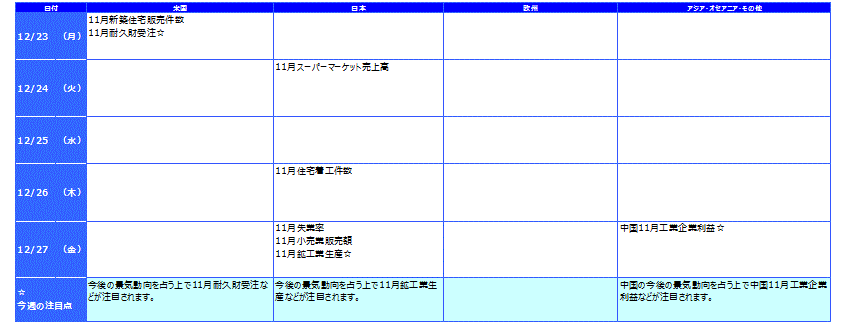 米国株式市場は、米中貿易協議の第1段階合意を受けて相場の先高観が広がっておりNYダウ、S&P500種株価指数、ナスダック総合株価指数共に過去最高値を更新しました。20日発表の11月の個人消費支出が前月比0.4%増え堅調な伸びが確認されたことや、半導体関連株が上昇したことなども寄与しました。NYダウは週間では1.14%上昇しました。日本株式市場は、米国株高などは好感されましたが、前週末の13日に日経平均株価が前日比598円29銭(2.55%)高と急騰した反動などから、週間では日経平均株価は0.86%下落しました。欧州株式市場では、ポンド相場の下落などを背景に、FTSE100指数は3.11%上昇しました。ドイツDAX指数は0.27%上昇しました。中国株式市場では、米中通商協議の進展や中国の鉱工業生産や小売統計等の良好な経済指標を受け上海総合指数が1.26%、香港ハンセン指数も0.66%上昇しました。