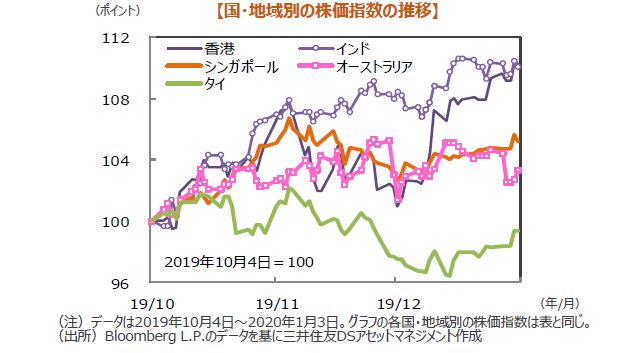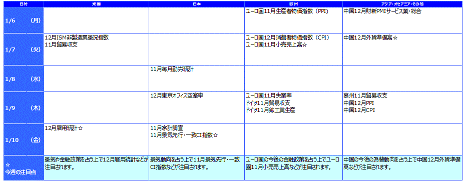 米国株式市場は、米中貿易協議の進展期待や中国の金融緩和策などを好感して堅調に推移し、主要指標は一時最高値を更新しました。その後は米軍がイラクの首都バグダッドでイラン革命防衛隊の精鋭組織の司令官を殺害し、中東情勢が悪化するとの警戒感が高まったことや、12月の製造業景況感指数が市場予想に反して前月から低下したことなどから下落しました。週間ではNYダウはほぼ横ばいとなりました。日本株式市場は、円高を嫌気したことや、年末年始の休場を控えてポジション整理の動きも出て、日経平均株価は0.76%下落しました。欧州株式市場は、中東情勢が悪化するとの警戒感などからFTSE100指数は0.29%、DAX指数は0.88%下落しました。中国株式市場は、中国人民銀行(中央銀行)が預金準備率を6日から0.5%引き下げると1日に発表したことなどを好感して香港ハンセン指数は0.80%、上海総合指数は2.62%上昇しました。