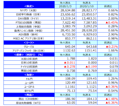 米12月雇用統計はやや弱い内容となりましたが、中東情勢への警戒感が後退したことなどから主要国の10年国債利回りは上昇しました。米国は0.031%、日本は0.011%、ドイツは0.079%、英国は0.031%の上昇となりました。