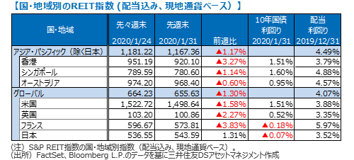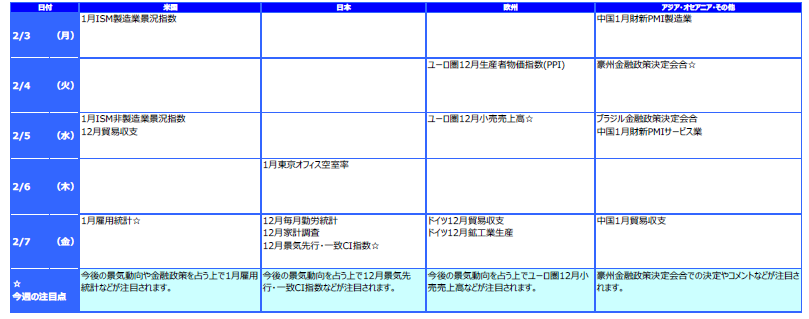 主要国の株式市場は中国の新型肺炎の感染拡大と経済への影響などを懸念して下落しました。米国株式市場は、中国の新型肺炎の感染拡大を受けて、米政府が中国全土への渡航警戒レベルを最高レベルに引き上げた他、米国企業の中国での業務休業の報道を受け業績懸念が強まり下落しました。週間ではNYダウは2.53%下落しました。日本株式市場は、3月期決算発表が続いていますが、その影響は限定的で、中国の新型肺炎の感染拡大を受けて、世界経済の減速懸念などを嫌気して下落しました。日経平均株価は2.61%下落しました。欧州株式市場は、DAX指数は中国の新型肺炎の感染拡大や低調な経済指標などを受けて4.38%、FTSE100指数は中国の新型肺炎の感染拡大や原油価格の値下がりなどを受けて3.95%下落しました。中国株式市場は、香港ハンセン指数が新型肺炎の感染拡大と経済への影響などを懸念して5.86%下落しました。上海市場は春節休暇のため休場でした。