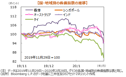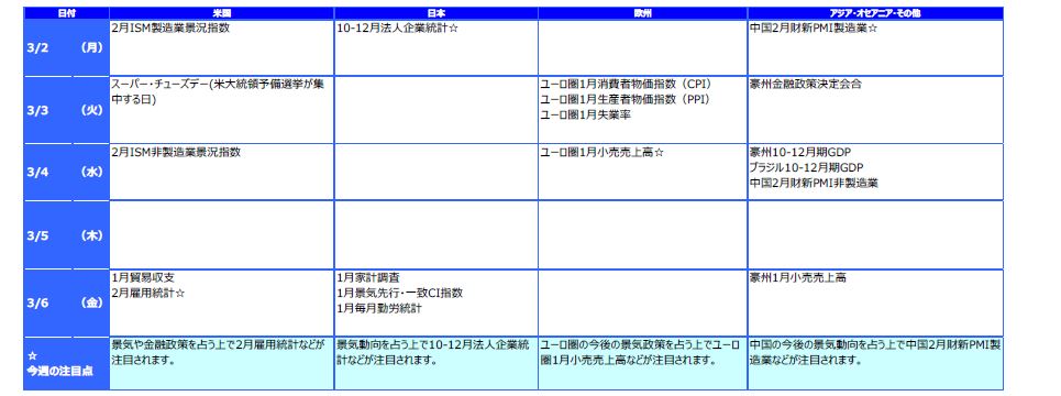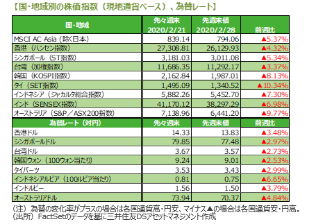 主要国の株式市場は新型肺炎の感染拡大と経済への影響などを懸念して大幅に下落しました。米国株式市場では、米疾病対策センター(CDC)が、米国内での新型肺炎の感染拡大は時間の問題だと警告したことや、米国で感染源不明の感染者が出たことなどから、NYダウの週間での下落幅は過去最大となりました。週間での下落率は12.36%となりました。日本株式市場では、新型肺炎の感染拡大や米国株安、円高などを嫌気して、日経平均株価が9.59%下落しました。欧州市場では、新型肺炎の感染拡大による景気悪化懸念が強まり、DAX指数は、12.44%、FTSE100指数は11.12%の大幅下落となりました。中国株式市場では、世界的な新型肺炎の感染拡大と経済への影響などを懸念して、上海総合指数は5.24%、香港ハンセン指数は4.32%下落しました。