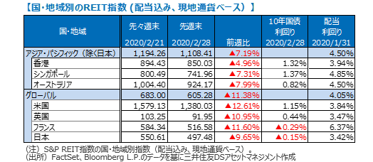米国の10年国債利回りは、新型肺炎の世界的な広がりによる世界経済の減速懸念などを受けて、利回りは過去最低を更新、週間では0.323%低下しました。日本、ドイツ、英国の10年国債利回りも大幅に低下しました。