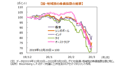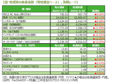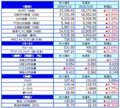 世界の株式市場は、欧州や米国を中心に新型コロナウイルスの感染拡大に歯止めがかからないことや原油価格の急落などを受けて、全面安となりました。米国株式市場では、米連邦準備制度理事会(FRB)が1%の緊急利下げを行った他、短期金融市場の機能をサポートする手立てを打ち出し、財政政策も発表されましたが、感染抑制のための外出禁止令などが嫌気されました。週間では17.3%の下落となり、リーマン・ショック直後の2008年10月以来の大きな下げを記録しました。日本株式市場は、欧州や米国を中心とした新型コロナウイルスの感染拡大や欧米株安を受けて、日経平均株価が、5.04%下落しました。欧州株式市場では、イタリア、スペインなどでの新型コロナウイルスの感染拡大などが嫌気され、DAX指数は3.28%、FTSE100指数は3.27%下落しました。中国株式市場では、上海総合指数は4.91%、香港ハンセン指数は5.11%下落しました。